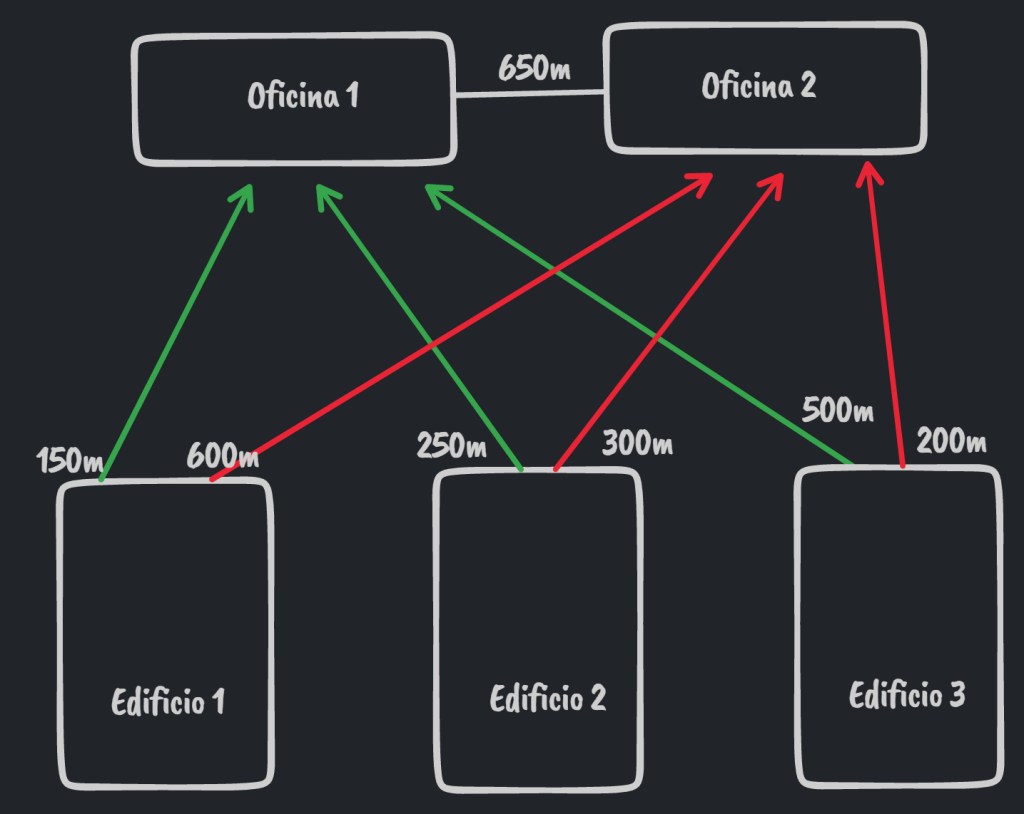 La distancia es de los puntos mas fundamentales ya que nos va a determinar que medio vamos a usar. No es igual solventar el problema en una oficina de 100m2 que en una situación como la planteada en el problema anterior. Tomando como referencia el dibujo posterior, descartamos completamente el uso de cualquier tipo de medio de cobre para interconectar edificios ya que superamos holgadamente el umbral de 100 metros y, estando en 2023, lo mínimo que necesitamos es conexión a 1GB.