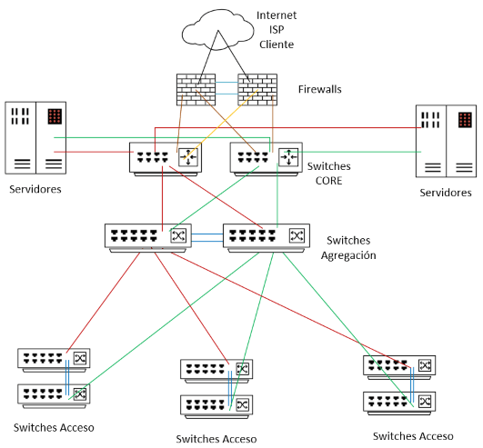 El propósito de estos switches es dar conexión a estos switches de campo. Con la situación planteada, plantearía unos switches de 24p SFP+ que conectaría mediante fibra óptica a los switches de campo. Por supuesto, al igual que en los switches de campo, aplicaría la tecnología de chasis virtual del fabricante que más nos guste. Por lo tanto, de la arquitectura física planteada en el punto anterior, pasaríamos a tener la siguiente arquitectura lógica: