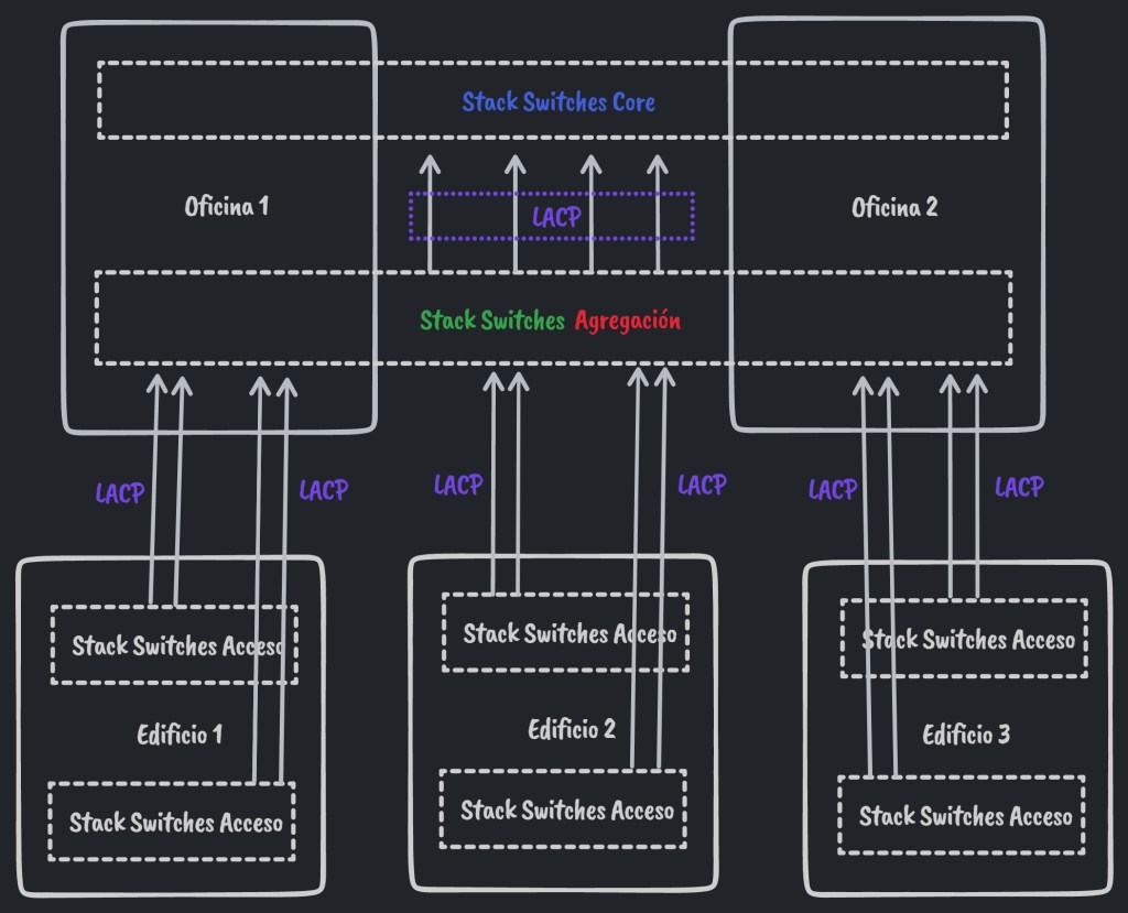 Por un lado, tenemos un grupo de switches de acceso que serán el punto de entrada de todos los dispositivos finales. Además, y buscando de nuevo la redundancia (y simplificar la gestión), los switches deberían formar un stack de 2 unidades. Dicho de otro modo, tendríamos 2 dispositivos físicos pero solo 1 lógico. Existen muchas formas de llamar a esta tecnología según el fabricante (Aruba VSF, HPE IRF, Cisco VSS…) pero al fin y al cabo todo acaban haciendo lo mismo.