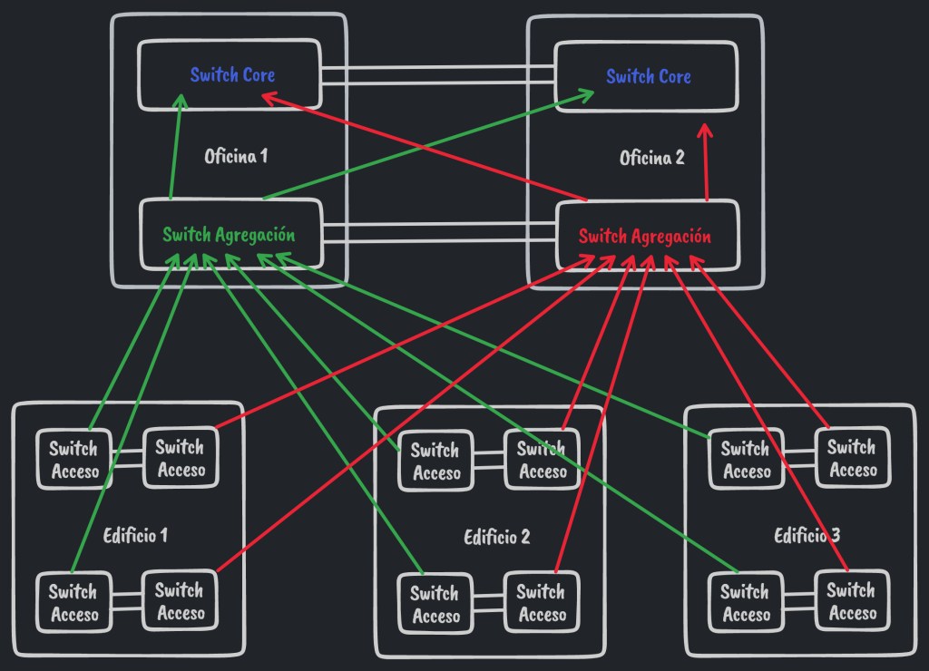 Supongamos que se nos plantea el siguiente problema: Necesitamos otorgar de comunicación a una serie de dispositivos que se encuentran en unas instalaciones de gran tamaño. Tenemos 5 edificios, en dos de ellos se encuentran las oficinas y en los otros 3, los dispositivos que deben de comunicar contra las aplicaciones y servicios que corren en una serie de servidores ubicados en los edificios de oficinas. En cada edificio tenemos dispositivos críticos, dispositivos sin importancia, dispositivos que conectan por WiFi, CCTV, etc. Los dispositivos críticos necesitan una baja latencia y la CCTV necesita buen ancho de banda para poder grabar y visualizar con fluidez todo lo que está pasando. Además, algunas de las cámaras son PoE. Dentro de cada edificio, los dispositivos están en varias localizaciones, separados en algunos casos por 120 metros. El número de elementos a comunicar por edificio está entre 20 y 70.