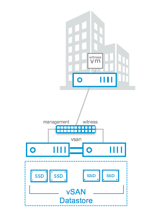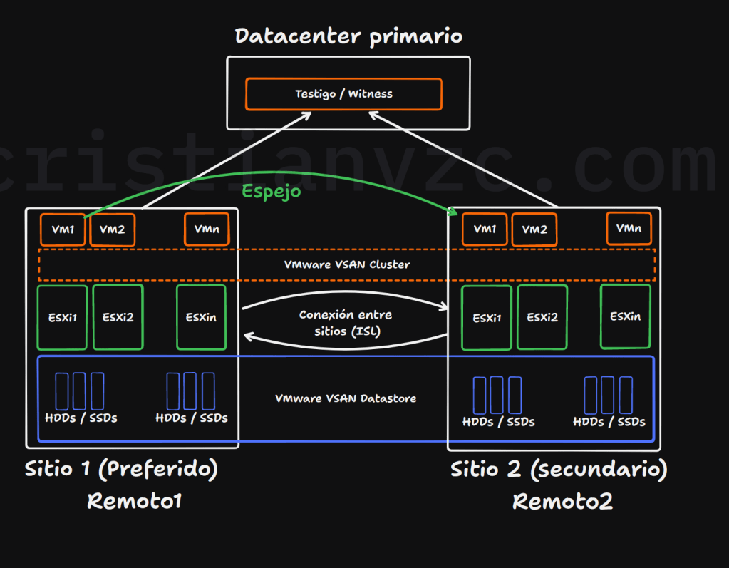 1 sitio vSAN primario y 1 sitio vSAN secundario separados físicamente pero con conexión directa entre ellos (inter-site-link, 5ms). Ambos sitios son redundantes entre sí mediante un testigo en una tercera ubicación (200 ms).