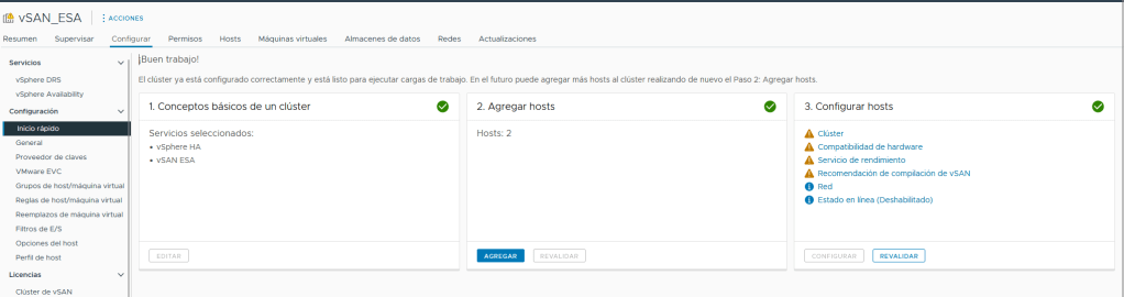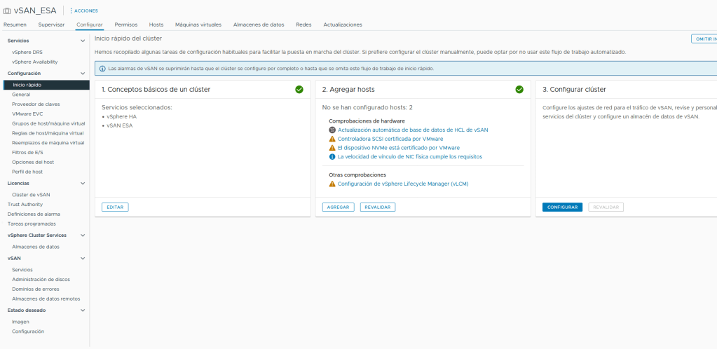 Por fin hemos conseguido cumplir con todos los requisitos que nos pide VMware para poder crear un clúster de vSAN. A continuación, podemos arrancar el wizard. Clúster > Configurar > Inicio rápido > Configurar.