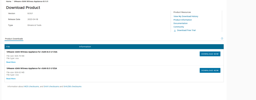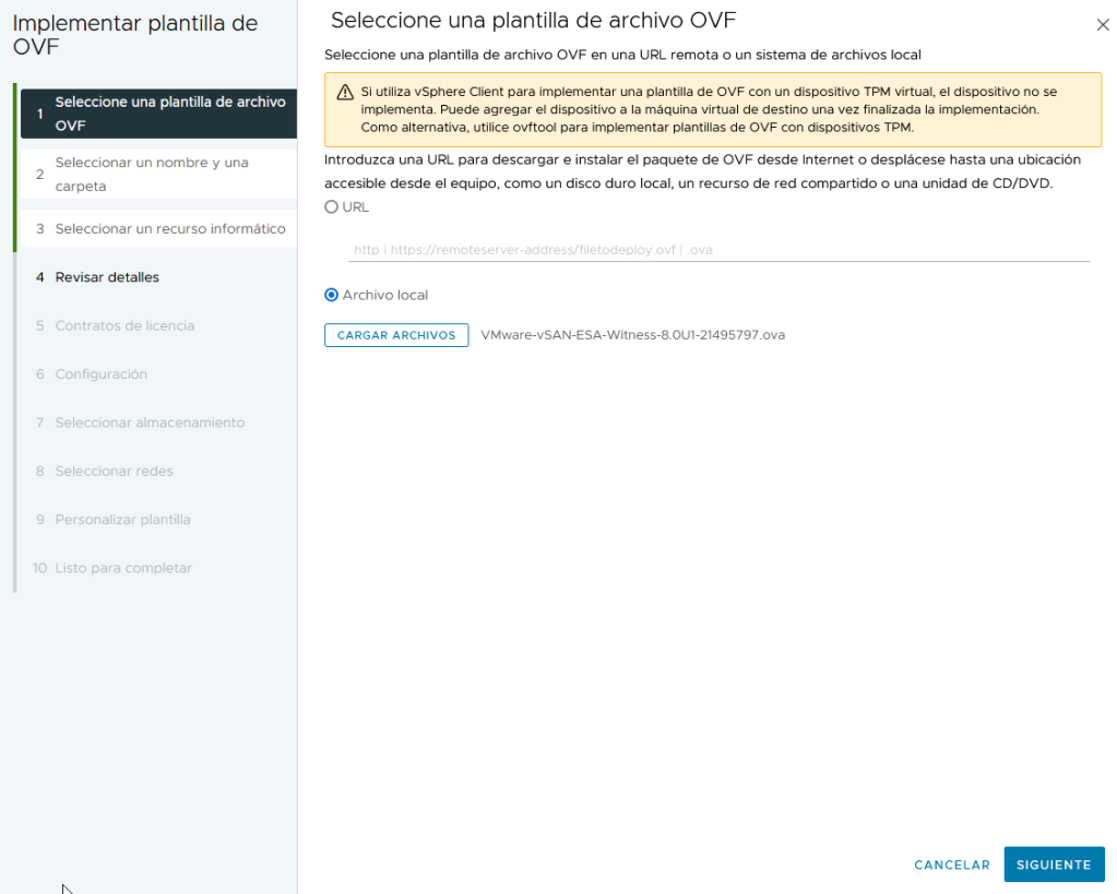 - Descargamos la OVA (VMware-vSAN-ESA-Witness-8.0U1-21495797) de vmware.com (enlace).