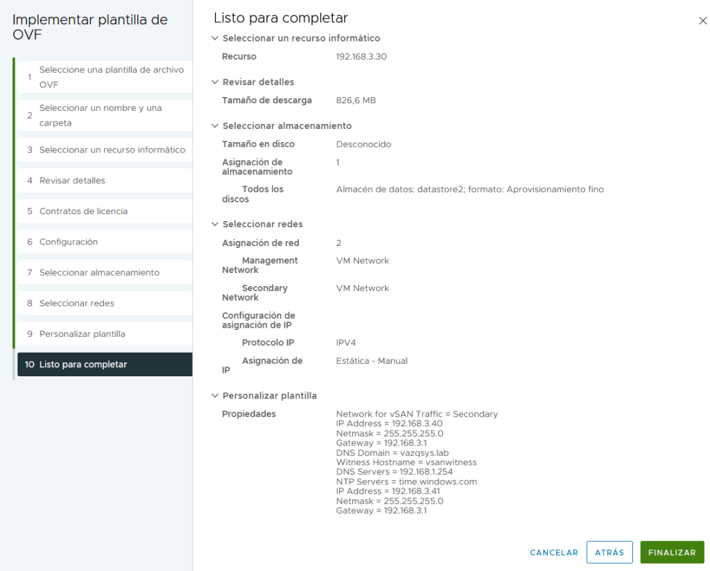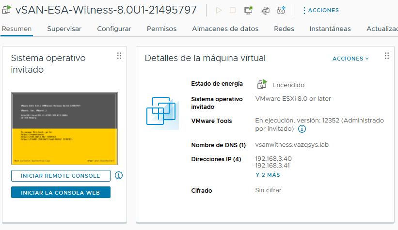 Este testigo puede ser un tercer ESXi o puede ser una máquina virtual (ESXi virtualizado) que este ejecutándose en otro host. El testigo NO puede formar parte del clúster vSAN. Por lo tanto, el clúster de «2 nodos» es mentira. Necesitas 2 nodos + un tercero que pueda ejecutar el testigo. El testigo se instala en modo appliance, con lo cual, puede correr en múltiples plataformas (HyperV..)