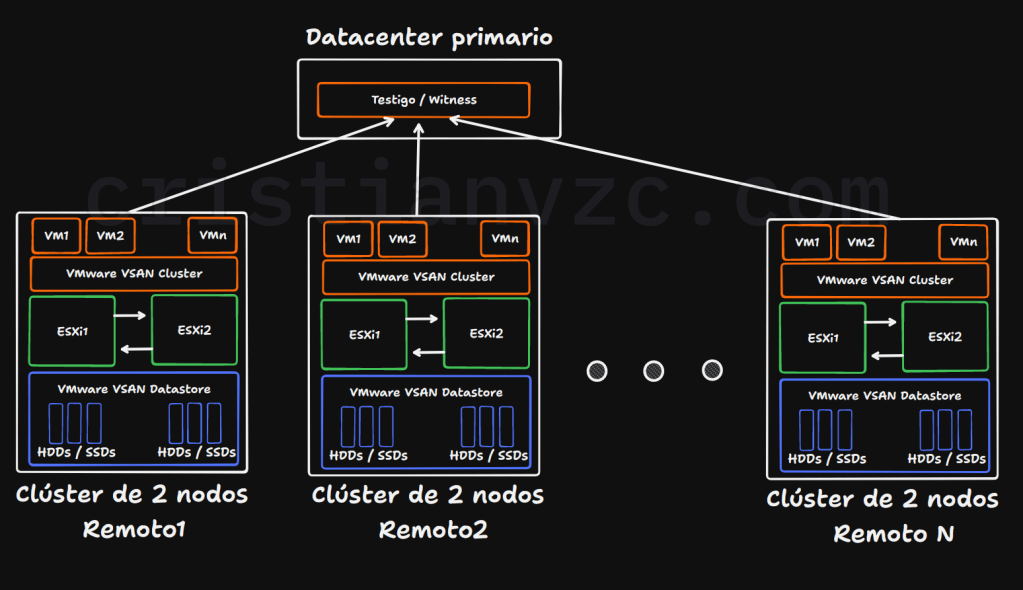 No obstante, voy a intentar hacer un resumen del hardware necesario para VMware vSAN clúster de 2 nodos.