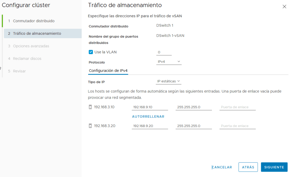 - Asigno dos direccionamientos IP diferentes para el tráfico vSAN entre nodos.