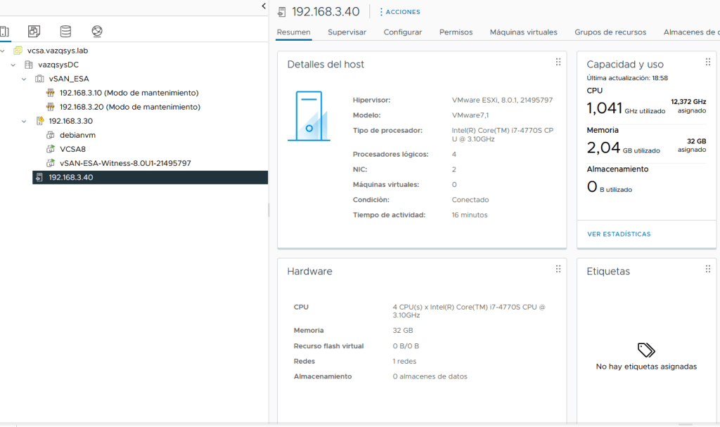 - 2 nodos ESXi recien instalados (VMware ESXi, 8.0.2, 22380479)